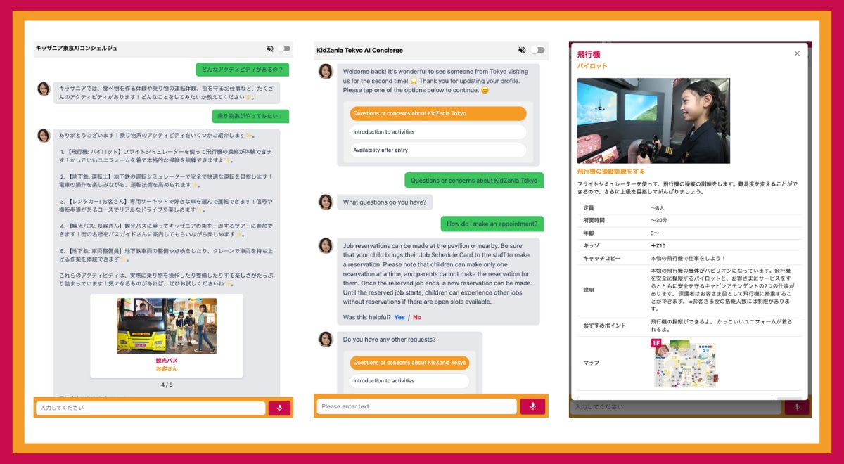 キッザニア東京の来場前・来場後における基本情報やQ&A(営業時間、施設概要、利用方法等)などを自然な対話形式でAIコンシェルジュが回答サポート。