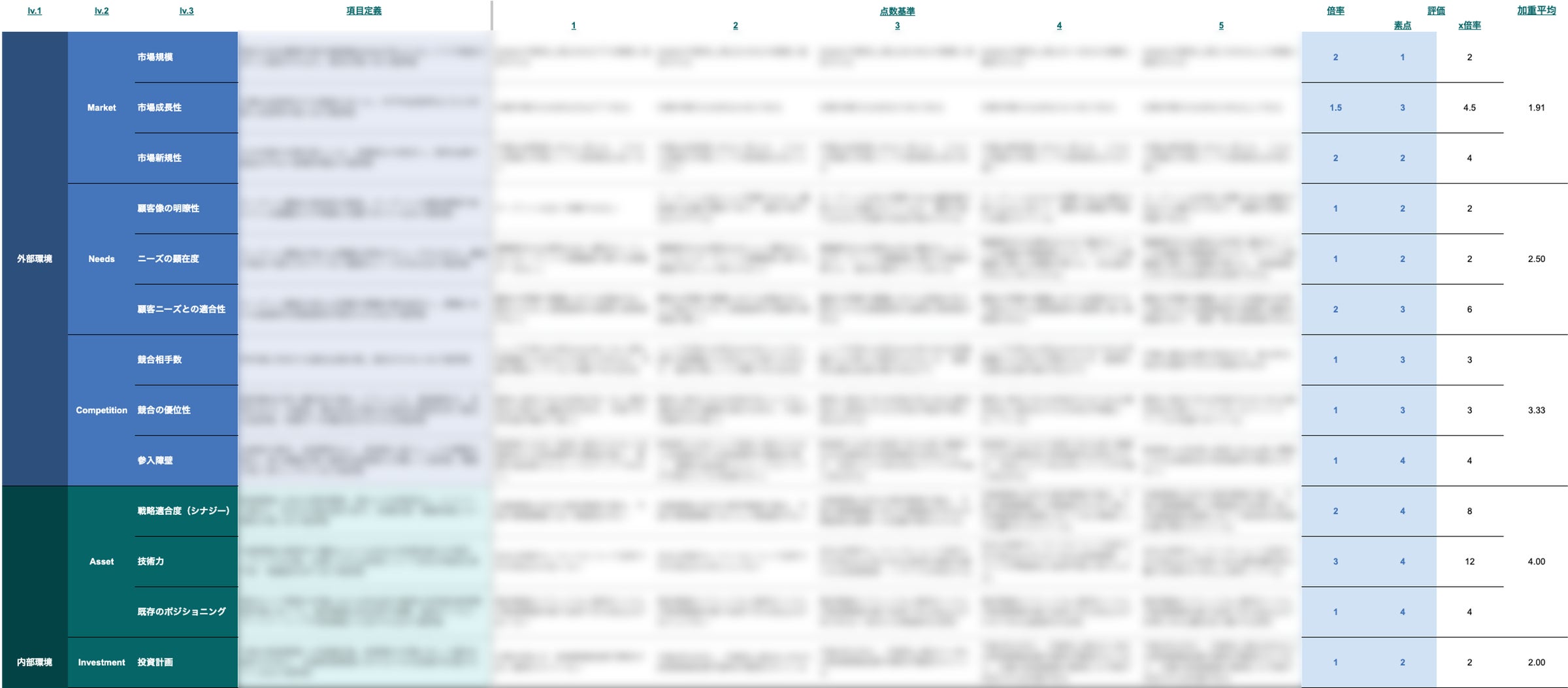 評価項目は、市場性、需要性、競争度、資源有用度、投資計画、組織力の6項目。それぞれの項目は詳細評価項目にブレイクダウンされ、評価点に倍率を掛けてスコアリングされます。