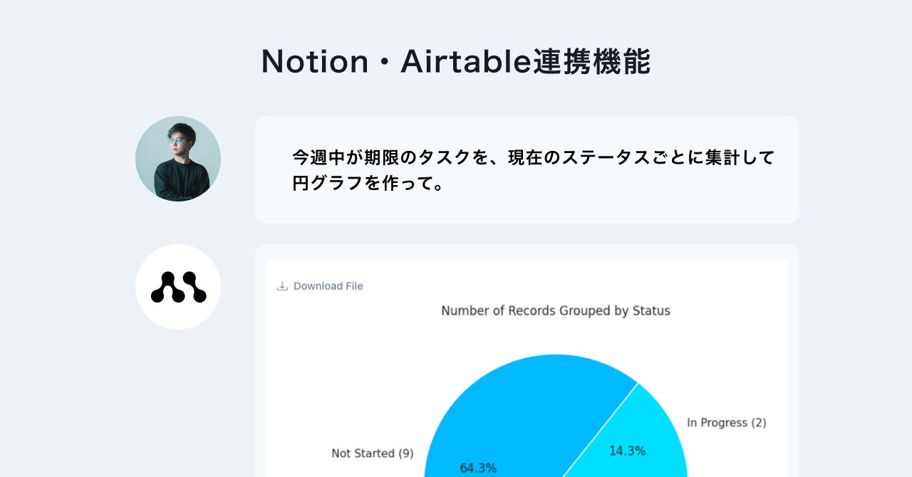 本機能のリリースにより、NotionのデータベースやAirtableで管理されている大規模なデータの整理や、Notebook機能により自然言語の命令によるデータ分析の実行が可能になりました。