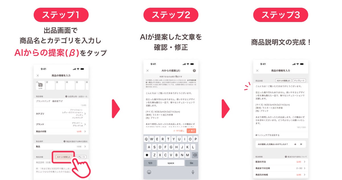 本機能は、出品時に商品名とカテゴリを入力・設定し、「AIからの提案(β)」をタップするだけで商品説明文が作成されます。また、商品名とカテゴリにくわえて、色やサイズ、商品の使用状態などの情報を設定すると、生成AIがその商品に適した説明文を作成するため、作成された文章の確認と調整のみで、初心者でも悩むことなくより簡単に出品できます。
