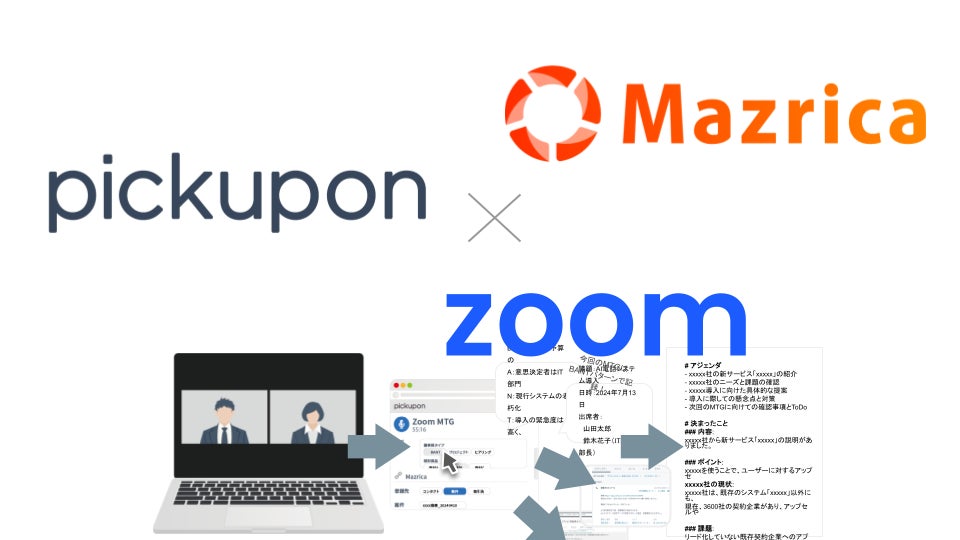 pickupon株式会社(千葉県市川市、代表:小幡洋一、以下「ピクポン」)が提供するSFAへの入力に特化した電話&MTG 議事録AI 「pickupon」は、このたび次世代型営業DXプラットフォーム「Mazrica」との連携を拡充し、MazricaへのZoom連携機能(β)をリリースいたしました。これにより、電話だけでなくZoomによるオンライン商談・ミーティングの内容も、SFA Mazricaへ自動的に記録されるようになり、より一層の営業DX化をサポートいたします。